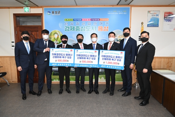 이번 성금은 음성청년회의소 100만원, 금왕청년회의소 회원과 감곡청년 회의소 박일서 회장이 각각 50만원씩 기부한 것으로 군은 사회복지공동모금회를 통해 동해시 피해 주민에게 전달할 예정이다.