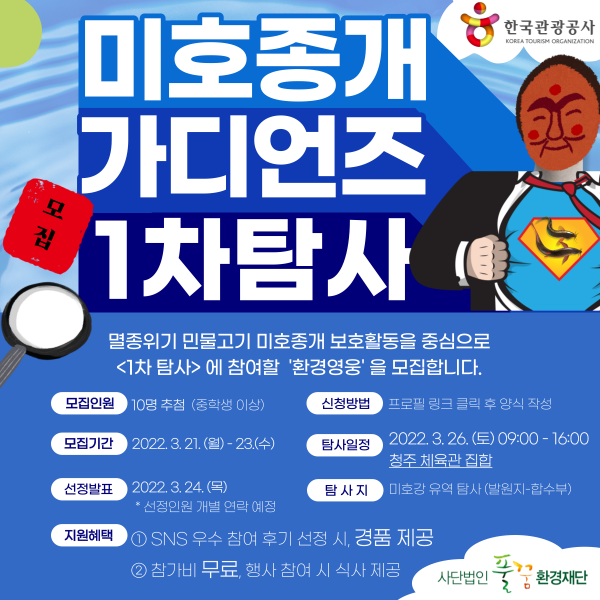[세종타임즈] 한국관광공사는 21일부터 충북지역 환경단체인 풀꿈환경재단과 함께 보호어종‘미호종개’와 연계한 환경탐사 일반인 체험단을 모집한다.