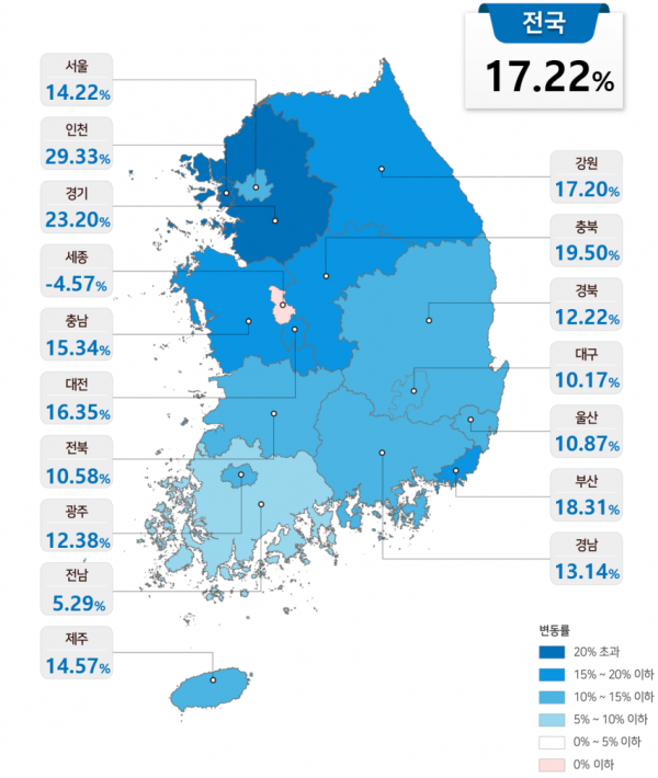 공시가격 변동률의 전년 대비 하락폭은 세종이 가장 크며 울산, 서울, 대구, 부산, 경기 등 주요 지역의 변동률도 전년 대비 하락했다.
