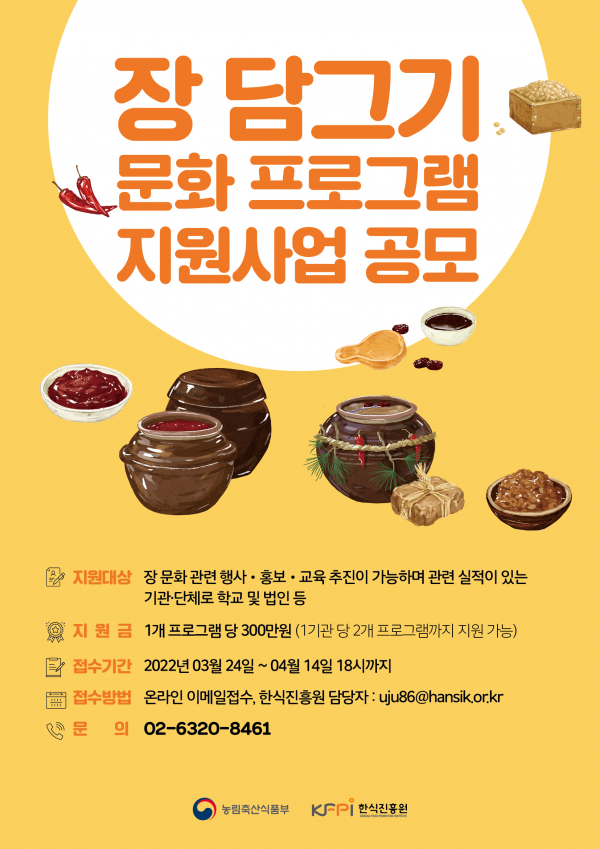 이번 장 담그기 문화 프로그램 지원 사업에 참여하기를 희망하는 단체는 4월 14일 오후 6시까지 한식진흥원 전자우편으로 신청서를 제출하면 된다.