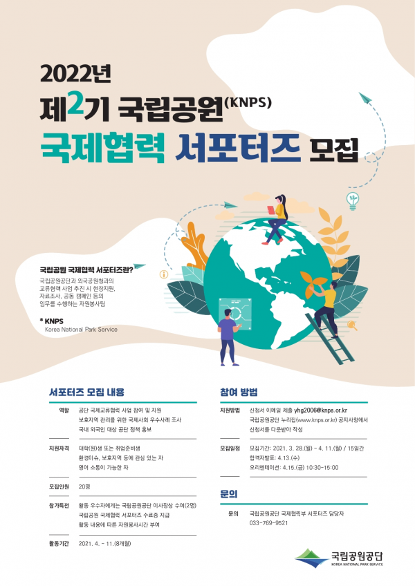 현병관 국립공원공단 상생협력처장은 “국립공원 등 보호지역과 관련된 국제협력에 관심이 많은 청년들에게 다양한 경험과 기회를 제공할 것”이라며 “기후변화 등 환경 쟁점과 자연환경 분야에 관심이 많은 청년들의 적극적인 참여를 기대한다“라고 말했다.