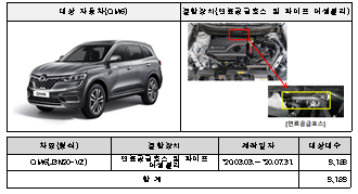 첫째, 르노삼성자동차㈜에서 제작, 판매한 QM6 9,189대는 연료공급호스 체결 불량으로 주행 중 호스가 분리되어 연료가 누유되고 이로 인해 주행 중 시동이 꺼지거나 화재가 발생할 가능성이 확인되어 자발적으로 시정조치에 들어간다.