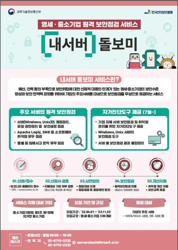 이에 과기정통부는 중소기업의 정보보안 역량을 제고하고자 보안전문가가 원격에서 주요 서버의 보안 취약점을 점검하고 조치해 주는 ‘내서버 돌보미 서비스’을 개시했다.