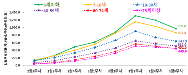 모든 연령대의 일평균 발생률이 전주 대비 감소했으나, 접종률이 낮고 접촉 빈도가 높은 학동기 연령에서 발생률이 높아, 0~9세 인구 10만명당 발생률이 1,015명으로 가장 높았다.