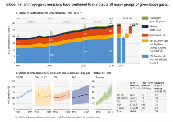 2010~2019년 동안 전 지구 순 인위적 온실가스 배출 총량은 지속적으로 증가했으며 온실가스 배출의 지역별 불균형 역시 지속되고 있음을 언급했다.