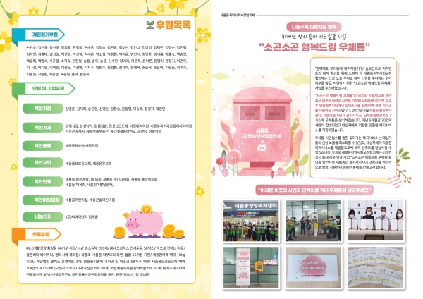 이번에 창간한 복지 나눔 소식지는 새롬동 민관협력특화사업 복지사각지대 발굴 및 지원내용 기부현황 및 후원방법 등 주민복지를 향상하기 위한 다양한 소식을 담고 있다.
