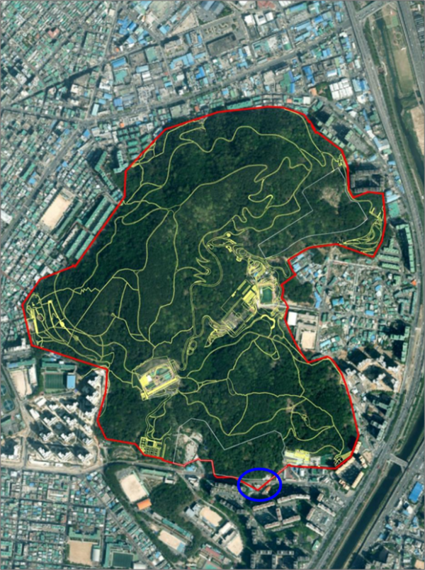2002년경 공원구역 남단을 횡단하는 도로가 신설되면서 전체 공원구역 면적 중 ㄱ씨 소유의 토지와 연접한 1필지는 도로 남측에, 나머지는 모두 도로 북측에 위치하게 됐다.