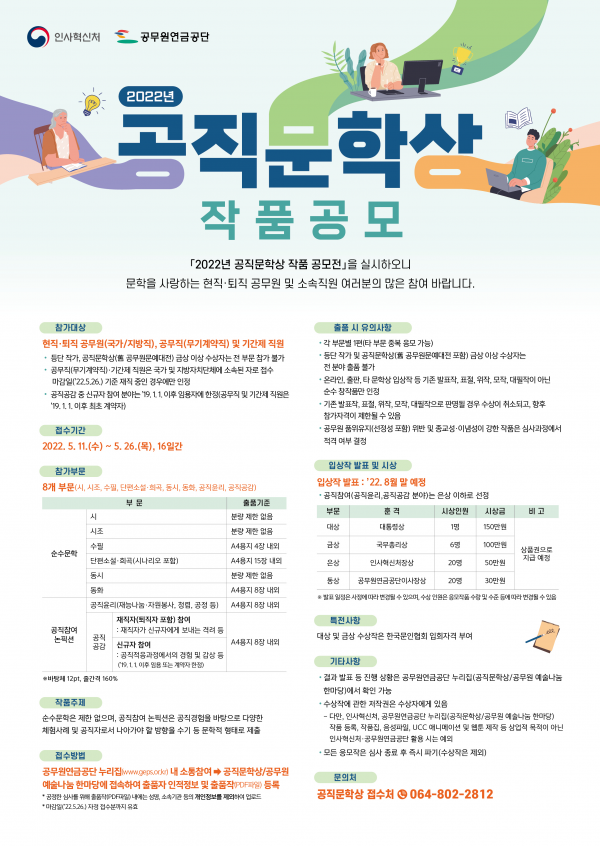 인사혁신처와 공무원연금공단은 국가·지방직 전·현직 공무원과 공무직을 대상으로 ‘2022년 공직문학상’을 개최한다고 11일 밝혔다.