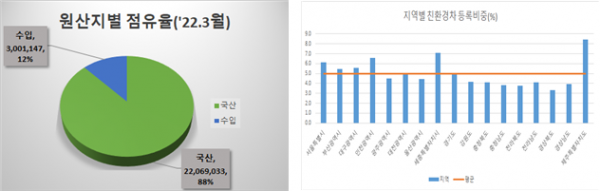 전기차의 원산지별, 지역별, 차종별, 제작자별 등록현황을 살펴보면 원산지별 ‘21년 신규등록 국산차 점유율은 74.1%였으며 올 1분기 국산차 점유율은 79.0%로 나타내었다.