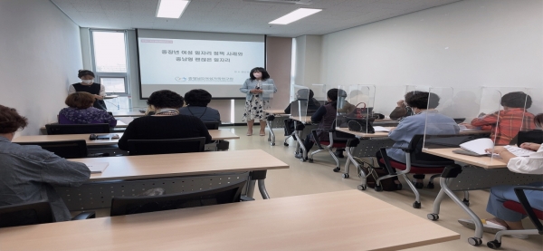 센터는 개강을 맞아 충남여성정책개발원 안수영 책임연구원을 초빙해 ‘충남 중장년 여성 일자리 실태 및 충남형 일자리 발굴’을 위한 강의를 진행했다.