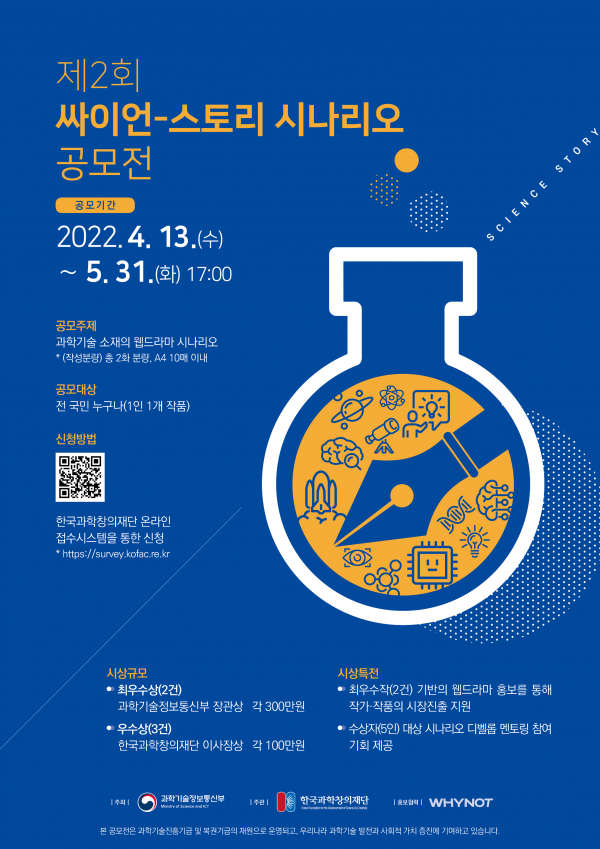 [세종타임즈] 과학기술정보통신부와 한국과학창의재단은 확장성과 대중성 등 성장 잠재력이 있는 과학기술 소재의 시나리오 발굴을 위한 ‘제2회 싸이언-스토리 시나리오 공모전’을 개최한다고 밝혔다.