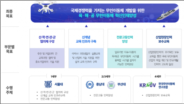 과학기술정보통신부는 육·해·공 무인이동체 혁신인재양성 사업 선정평가 결과, 주관대학으로 서울대학교, 지역거점대학으로 충남대학교·부산대학교, 참여대학으로 인하대학교 등 10개 대학과 한국무인이동체연구조합이 참여하는 컨소시엄이 최종 선정되어 사업을 본격 추진한다고 밝혔다.