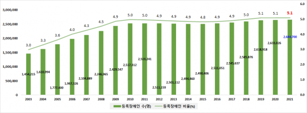 등록장애인은 264만 5,000명으로 전체 인구대비 5.1%이며 ‘20년 말 대비 1만 2,000명 증가했다.