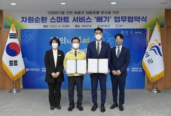 [세종타임즈] 부여군은 지난 19일 대형폐기물 간편배출 서비스 ‘빼기’ 도입 업무협약을 체결했다.