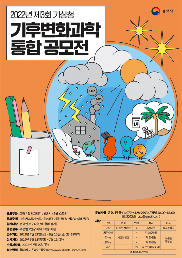 공모 주제는 ‘기후변화과학’으로 기후변화로 인한 기후시스템의 변화와 기후변화가 사회·문화·경제 등에 미치는 영향 기후변화에 따른 미래 모습을 그림과 글로 표현한 작품으로 참여할 수 있다.