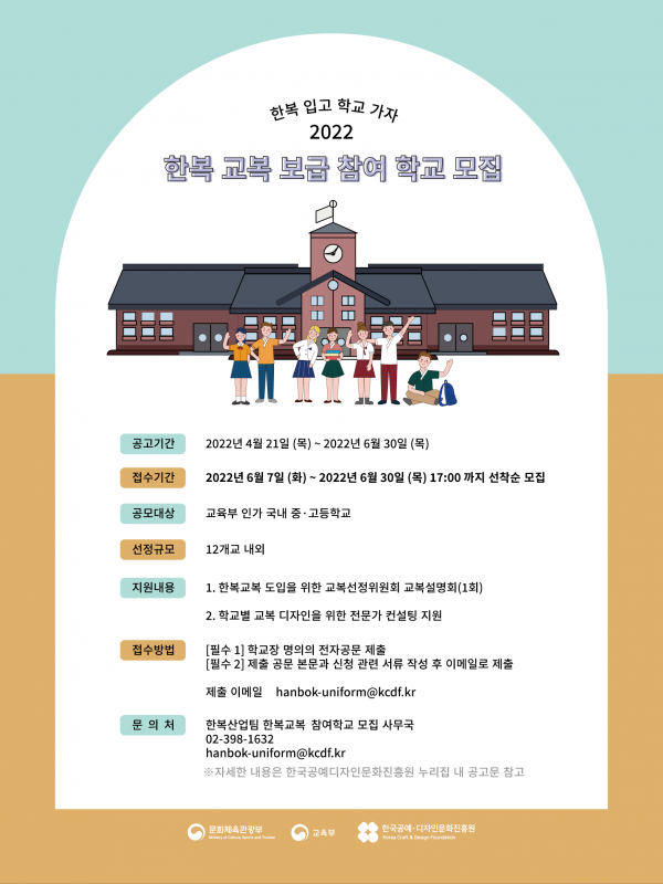 [세종타임즈] 문화체육관광부는 교육부와 함께 오는 4월 21일부터 6월 30일까지 ‘한복교복 보급사업’에 참여할 중·고등학교 12개교를 공모한다.