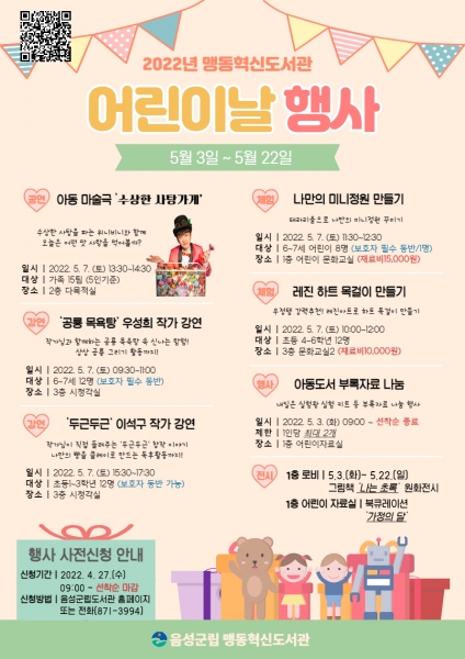 이번 행사에서 맹동혁신도서관은 어린이 마술극 ‘수상한 사탕가게’ ‘공룡 목욕탕’ 우성희 작가의 저자 강연 ‘두근두근’ 이석구 작가의 저자 강연 나만의 정원 만들기 레진 하트 목걸이 만들기 아동도서 부록자료 나눔 행사 ‘나는 초록’ 원화 전시 등을 진행해 어린이들에게 다양한 체험의 기회를 제공할 예정이다.