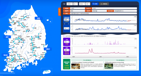 수질자료는 생물화학적산소요구량, 총인 등 총 7가지 항목을 제공하며 수생태자료는 주요 출현 어종에 대한 정보도 알려준다.