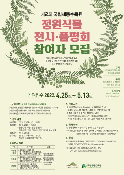 [세종타임즈] 한국수목원정원관리원은 ‘22년 상반기 정원식물 전시·품평회’ 참여자를 5월 13일까지 모집한다고 밝혔다.