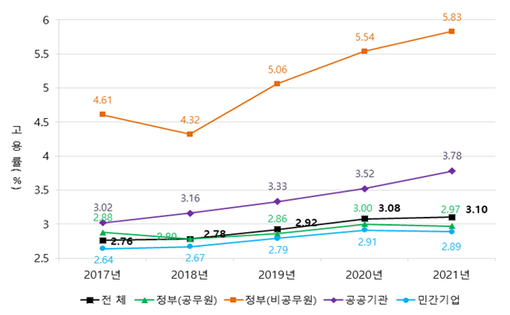 국가·지방자치단체 근로자 부문의 장애인 고용률은 5.83%로 전년 대비 0.29%p 상승했으며 네 부문 중 가장 높은 상승률을 보여 공공부문의 장애인 고용을 선도했다.