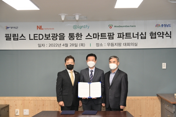 [세종타임즈] 부여군과 시그니파이코리아, 농업회사우듬지팜㈜은 지난 28일 토망고 증산과 과일 품질혁신을 위한 업무협약을 체결했다.