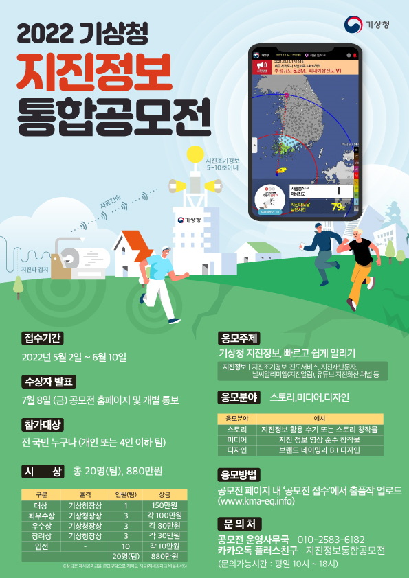 [세종타임즈] 기상청은 5월 2일부터 오는 6월 10일까지 국민의 지진정보에 대한 이해와 공감을 확산시키기 위해 ‘2022년 기상청 지진정보 통합 공모전’을 개최한다.