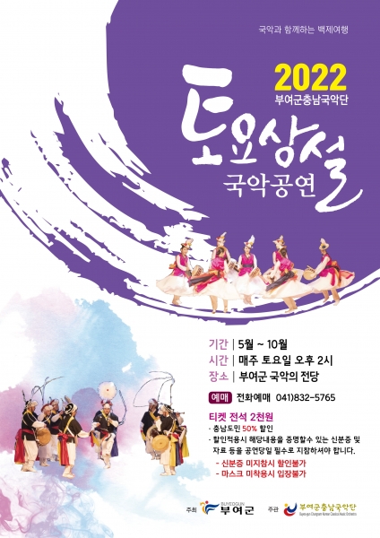토요상설 국악공연은 오는 10월 29일까지 매주 토요일 2시 부여군 규암면에 자리한 부여국악의전당에서 열리며 좌석권 예매는 부여군충남국악단 행정실로 전화 예매할 수 있다.