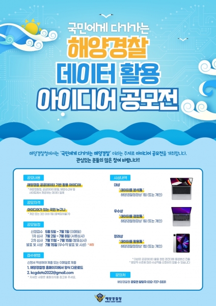 해양경찰 데이터 활용에 관심 있는 국민은 누구나 참여할 수 있으며 공모접수 기간은 5월 5일부터 7월 1일까지이다.