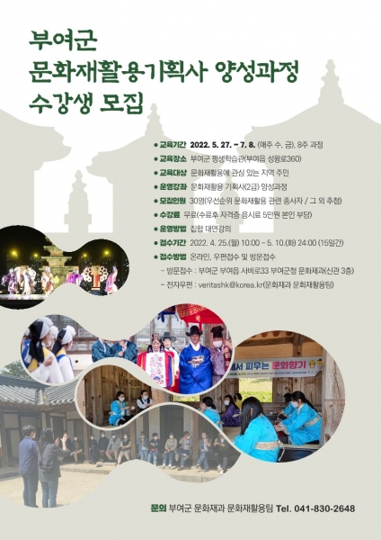 [세종타임즈] 부여군은 오는 13일까지 군민을 대상으로 ‘문화재활용기획사 양성과정’ 수강생을 모집한다.
