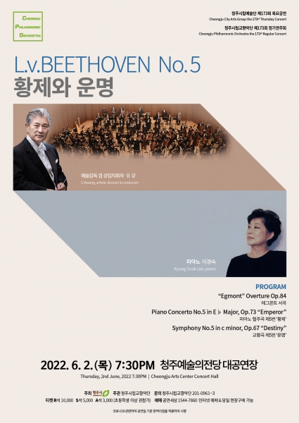 풍부한 감성과 정확한 곡 해석으로 작품에 존경을 담아 연주에 임하는 유광 예술감독 겸 상임지휘자의 지휘 아래 완벽한 사운드와 하모니를 이루는 청주시립교향악단의 연주로 만나는 이번 공연은 루드비히 판 베토벤의 명 작품들 중 No.5에 해당하는 교향곡 제5번 ‘운명’과 피아노 협주곡 제5번 ‘황제’를 그리고 유명 서곡인 ‘에그몬트 서곡’까지 감상할 수 있다.
