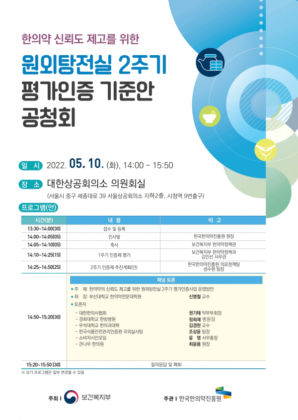 [세종타임즈] 보건복지부는 5월 10일 오후 2시 ‘원외탕전실 2주기 평가인증 기준안’에 대한 공청회를 개최한다고 밝혔다.
