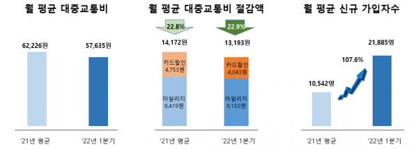 전국 17개 광역시도 158개 시군구가 참여하고 있는 알뜰교통카드 이용자들은 ‘22년도 1분기 월 평균 13,193원을 아껴 대중교통비 지출액의 22.9%를 절감했으며 또한, 알뜰교통카드 이용자는 ‘22년 1분기에 65,656명이 증가했고 전년도 월 평균 10,542명 대비 대폭 증가한 것으로 나타났다.