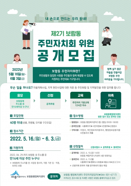 [세종타임즈] 세종특별자치시 보람동이 오는 16일부터 6월 3일까지 ‘제2기 보람동 주민자치회 위원’을 공개모집한다.