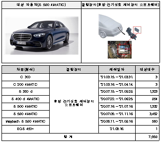 첫째, 메르세데스벤츠코리아㈜에서 수입, 판매한 S 580 4MATIC 등 8개 차종 7,598대는 후방 전기신호 제어장치)의 소프트웨어 오류로 차량 시동 시 장치가 정상적으로 초기화되지 않아 방향지시등, 비상경고등, 후퇴등이 제대로 작동되지 않고 이로 인해 사고가 발생할 가능성이 확인되어 자발적으로 시정조치에 들어간다.
