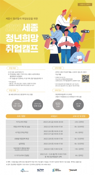 [세종타임즈] 세종특별자치시와 세종테크노파크 청년희망내일센터는‘세종 청년희망 취업캠프’를 개최해 하반기 공채를 앞둔 세종시 청년 구직자의 취업을 지원하고자 자기소개서 작성 및 컨설팅 인적성 특강 유형별 면접 준비 방법 기업 인사 담당자 특강 등 실전형 프로그램을 구성해 운영할 계획이라고 전했다.
