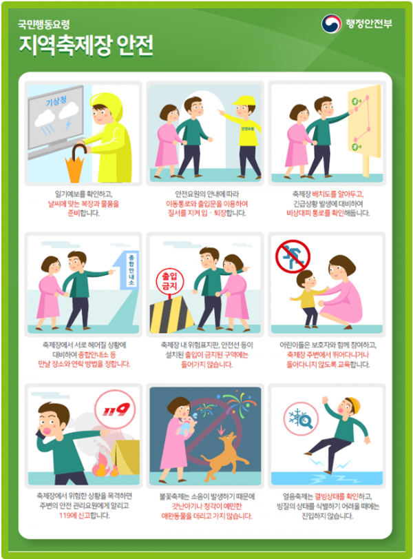 많은 사람이 모이고 복잡한 축제·행사장일수록 사소한 부주의도 큰 사고로 이어지기 쉬우니 주의하고 특히 어린이를 동반할 때는 항상 보호자와 함께해야 한다.