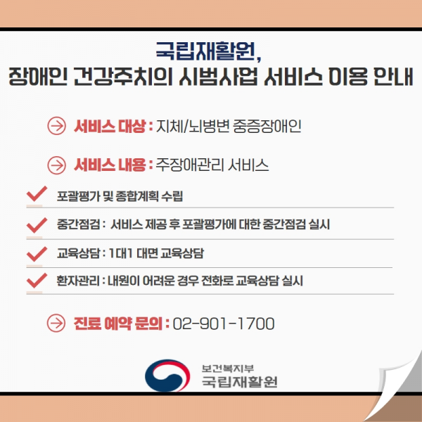 국립재활원은 지체·뇌병변 중증장애인에게 장애인 건강주치의 시범사업 서비스 유형 중 주장애관리 서비스를 제공하며 서비스 주요 내용은 다음과 같다.