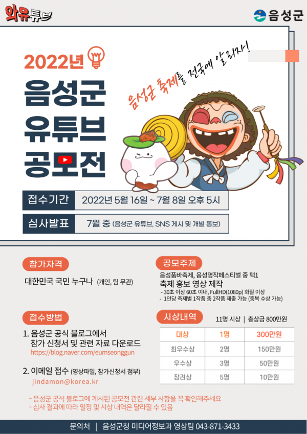 군은 이번 공모전을 음성군 축제를 전국에 알리고 군 유튜브 활성화를 위해 기획했다.