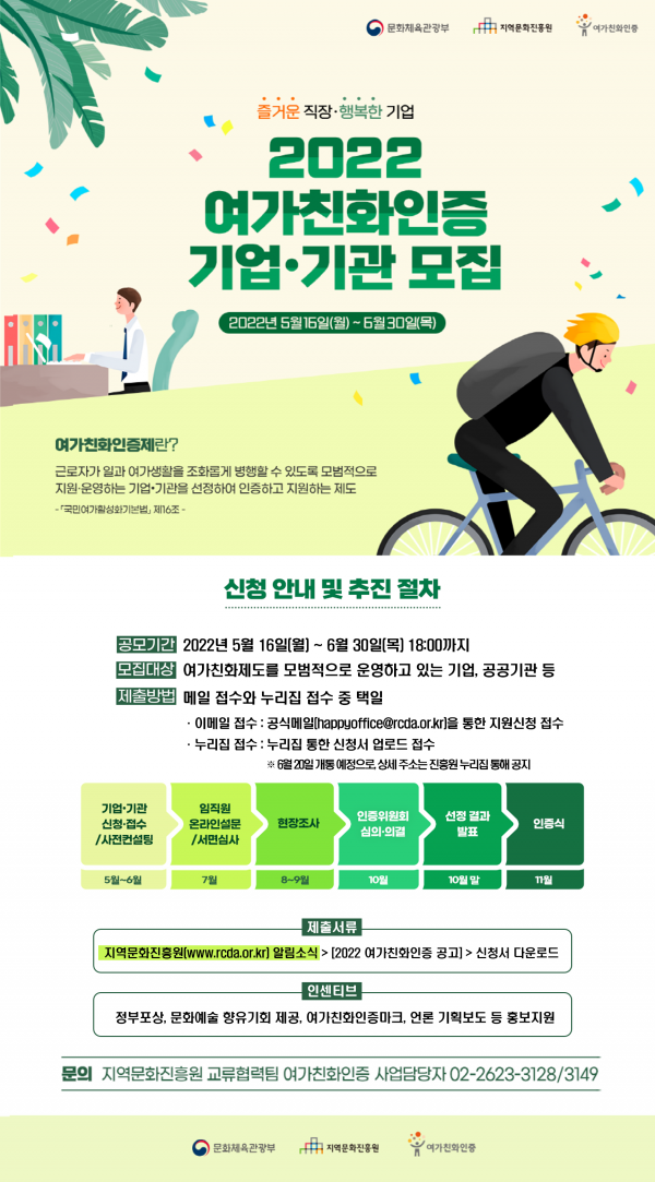 [세종타임즈] 문화체육관광부는 지역문화진흥원과 함께 5월 16일부터 6월 30일까지 기업과 기관을 대상으로 ‘2022 여가친화인증’ 신청을 받는다.