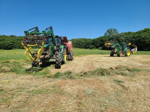 초종별 수확 시기는 이탈리안라이그라스는 출수기, 청보리는 황숙초기 등이 적기에 해당되며 곤포사일리지는 적정 수분함량이 65~70% 내외로 포장에서 사전 건조를 통해 수분함량을 충분히 맞춰야 한다.