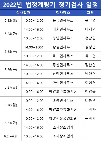 [세종타임즈] 청양군은 상거래의 공정성 확보와 군민의 소비생활 보호를 위해 5월 23일부터 6월 8일까지 2022년도 법정계량기 정기 검사를 실시한다고 밝혔다.