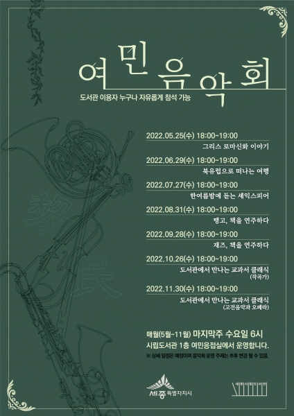 세종시립도서관은 이달부터 오늘 11월까지 매월 마지막 주 수요일 오후 6시에 시립도서관 1층 여민응접실에서 여민음악회를 개최한다고 23일 밝혔다.