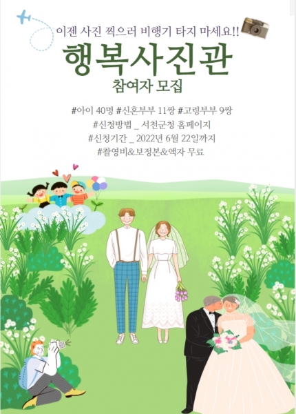 [세종타임즈] 서천군이 6월 22일까지 군민들의 소중한 순간을 기념하는 ‘행복사진관’의 참여자를 모집한다고 밝혔다.