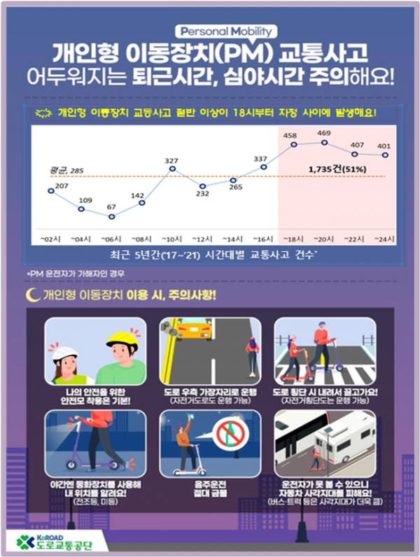 최근 5년 동안 개인형 이동장치로 인한 교통사고는 2017년 117건에서 2021년에는 1,735건으로 약 15배 정도 가파르게 증가했다.