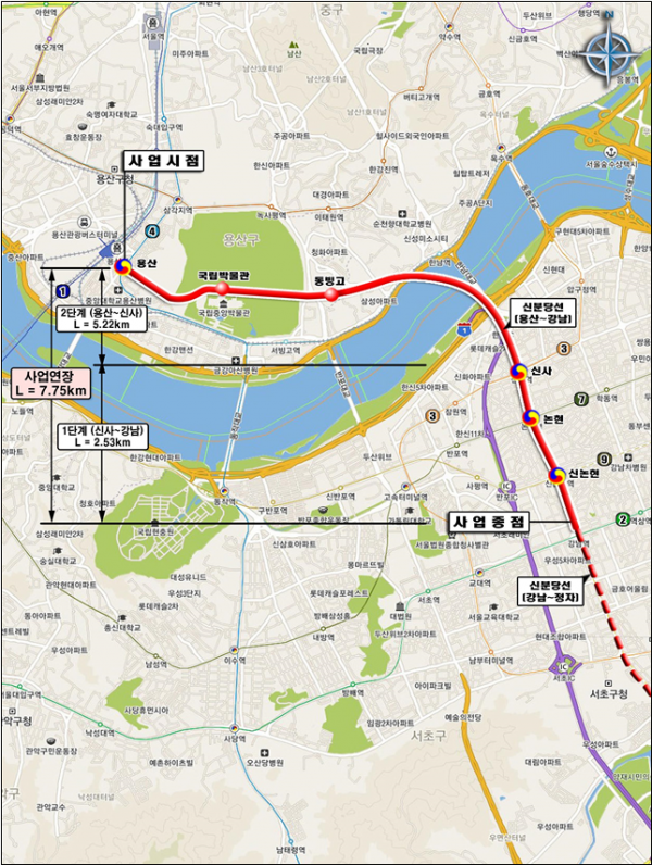 신사~용산까지 총 5.3km 구간은 미군기지 반환 이전에 정거장 개착공사 등을 할 수 있도록 대안노선을 마련하고 있으며 국방부·미군·국립중앙박물관 등 관계기관 협의를 거쳐 올해 안에 최종 노선을 확정할 계획이라고 전했다.