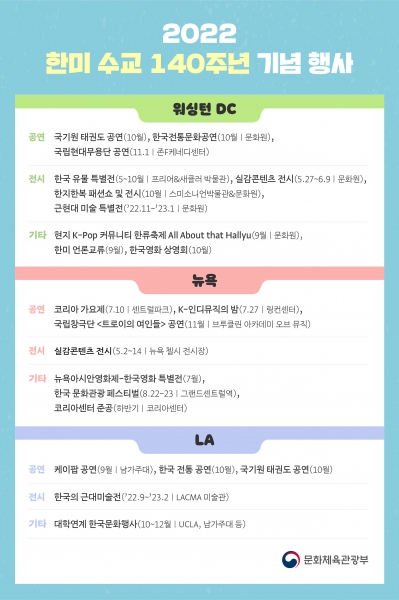 [세종타임즈] 문화체육관광부는 한국국제문화교류진흥원, 해외문화홍보원 등과 함께 2022년 한미 수교 140주년을 기념해 5월부터 워싱턴과 뉴욕, 로스앤젤레스 등 3개 도시에서 다양한 문화교류 행사를 진행한다.