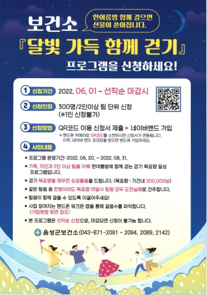 [세종타임즈] 음성군보건소는 여름철 지역주민의 건강생활실천을 위해 팀을 이뤄 함께 걷는 ‘달빛 가득 함께 걷기’ 프로그램 신청자를 모집한다고 30일 밝혔다‘달빛 가득 함께 걷기’ 프로그램은 가족, 지인과 2인 이상 팀을 이뤄 신청한 참여자 300명이 프로그램 운영 기간 내에 30만 보를 팀원과 함께 걸어야 성공할 수 있는 건강 걷기 프로그램으로 성공 시 인센티브 홍보물을 제공한다.