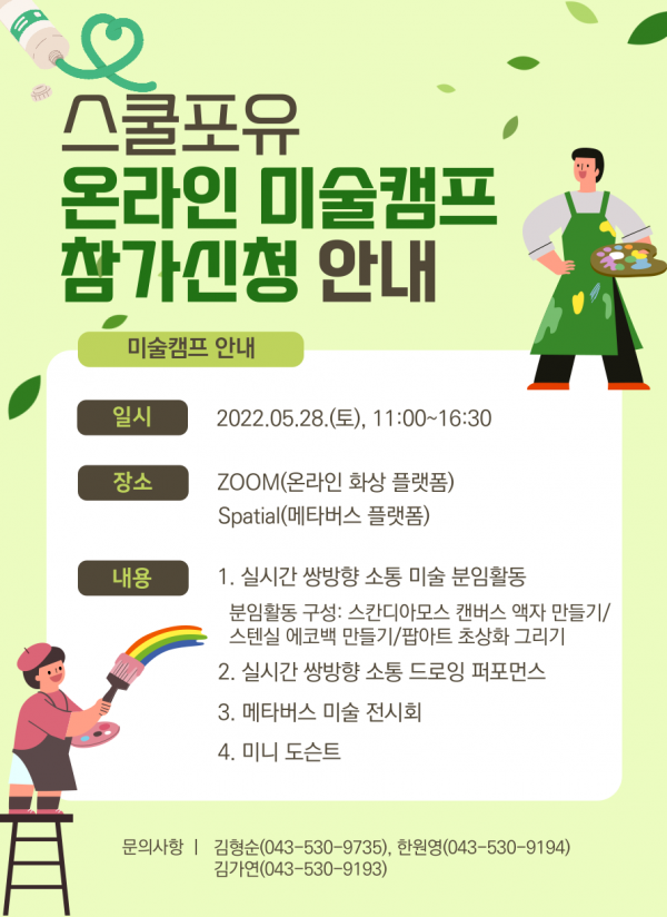 모든 활동에는 학생과 학부모가 함께 참여할 예정이며 스쿨포유를 이용하는 초중고 학생, 가족 등 270여명은 사전에 선택한 미술 체험 유형에 따라 온라인 분임을 구성해, 참가자들과 상호 교류하며 미술작품 만들기 활동에 참여한다.
