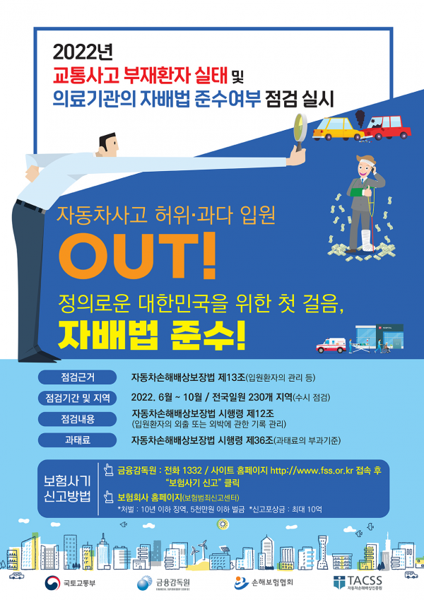 합동점검은 경미한 교통사고 후, 통원치료가 가능함에도 보험금을 목적으로 거짓으로 입원하거나 불필요하게 장기 입원하는 허위·과다입원환자를 적발하기 위한 것으로 의료기관을 대상으로 입원환자 부재현황 및 입원환자 외출·외박 기록관리 의무 준수 여부를 집중 점검한다.