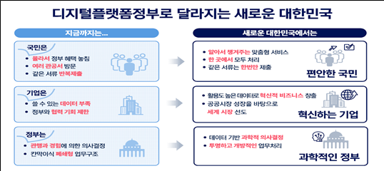 특히 국민에게는 통합적·선제적·맞춤형 행정서비스를, 기업에게는 새로운 혁신의 기회를, 정부에게는 과학적으로 일할 수 있는 기반을 마련한다는 계획을 설명한다.